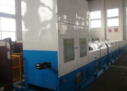 14、交流變頻直線式拉絲機電氣控制系統(tǒng):本系統(tǒng)采用變頻器調(diào)速,PLC程序控制器集控的方式,實現(xiàn)數(shù)字化自動化控制。機臺上每個頭都有啟動、停止、點動按鈕、張力氣壓調(diào)節(jié);機臺前緊急停車?yán)K。觸摸屏上有速度顯示與調(diào)速,重量或者長度設(shè)定或解除。運行機臺號,運行電流(觀察電流大小可以清晰知道模具磨損狀態(tài)),運行頻率(觀察頻率大小可以知道實際最大工作速度),每個頭的功率。觸摸屏上輸入實際運行的模具,可以直觀的顯示每道次的減面率,避免不合理的拉拔,通過觀察電流的波動可以發(fā)現(xiàn)并調(diào)整損壞的模具避免生產(chǎn)廢絲!系統(tǒng)還具備一些特色功能:穿絲點動永不斷絲功能,高速運行中斷絲自動緊急停車功能,遠程監(jiān)控檢修功能。所以高自動化智能化的電氣控制系統(tǒng)是高效低成本高質(zhì)量拉拔低碳鋼絲的最先進技術(shù)。